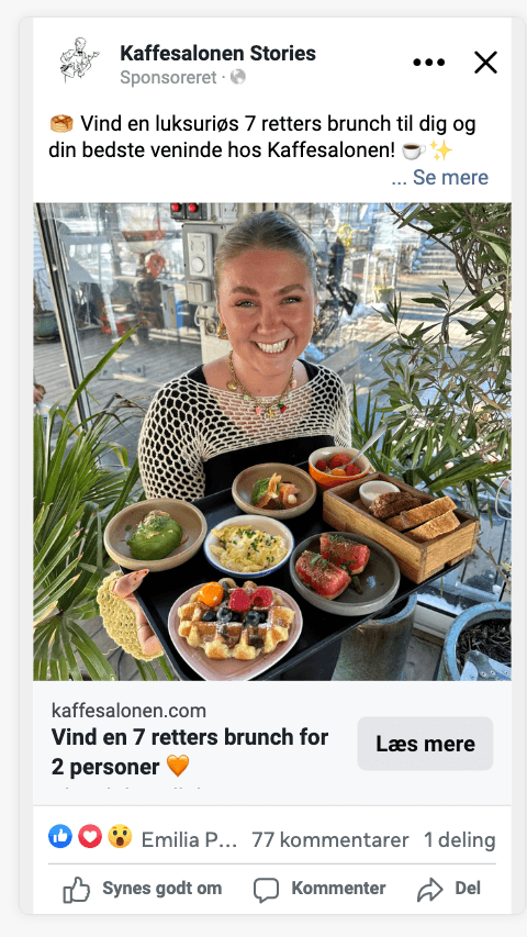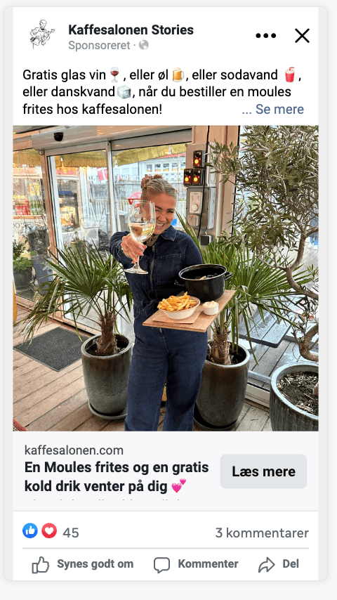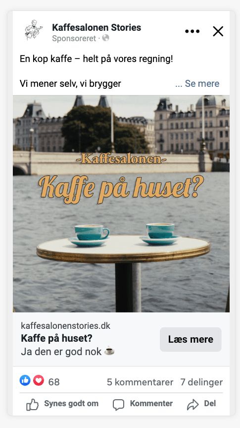 For Kaffesalonen har jeg filmet, redigeret og opsat flere Meta-annoncer (se eksempler længere nede på siden). Den største kampagne, jeg udviklede, var “Gratis kaffe-kampagnen”. Her byggede jeg ikke blot selve annoncen, men også hele flowet, der skulle få flere mennesker ned i caféen – og konvertere dem til loyale kunder.