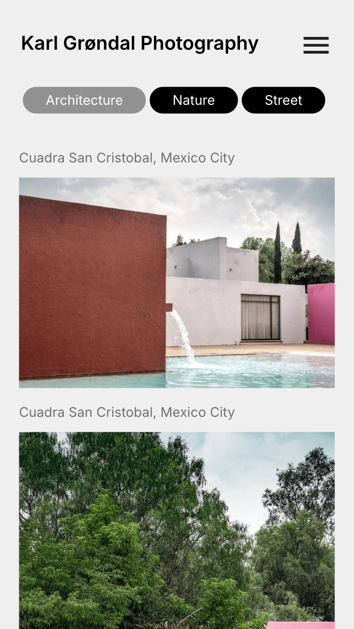 Det giver en nemmere og mere naturlig brugeroplevelse på små skærme, samtidig med at det visuelle udtryk forbliver rent og fokuseret på Karls fotografier.